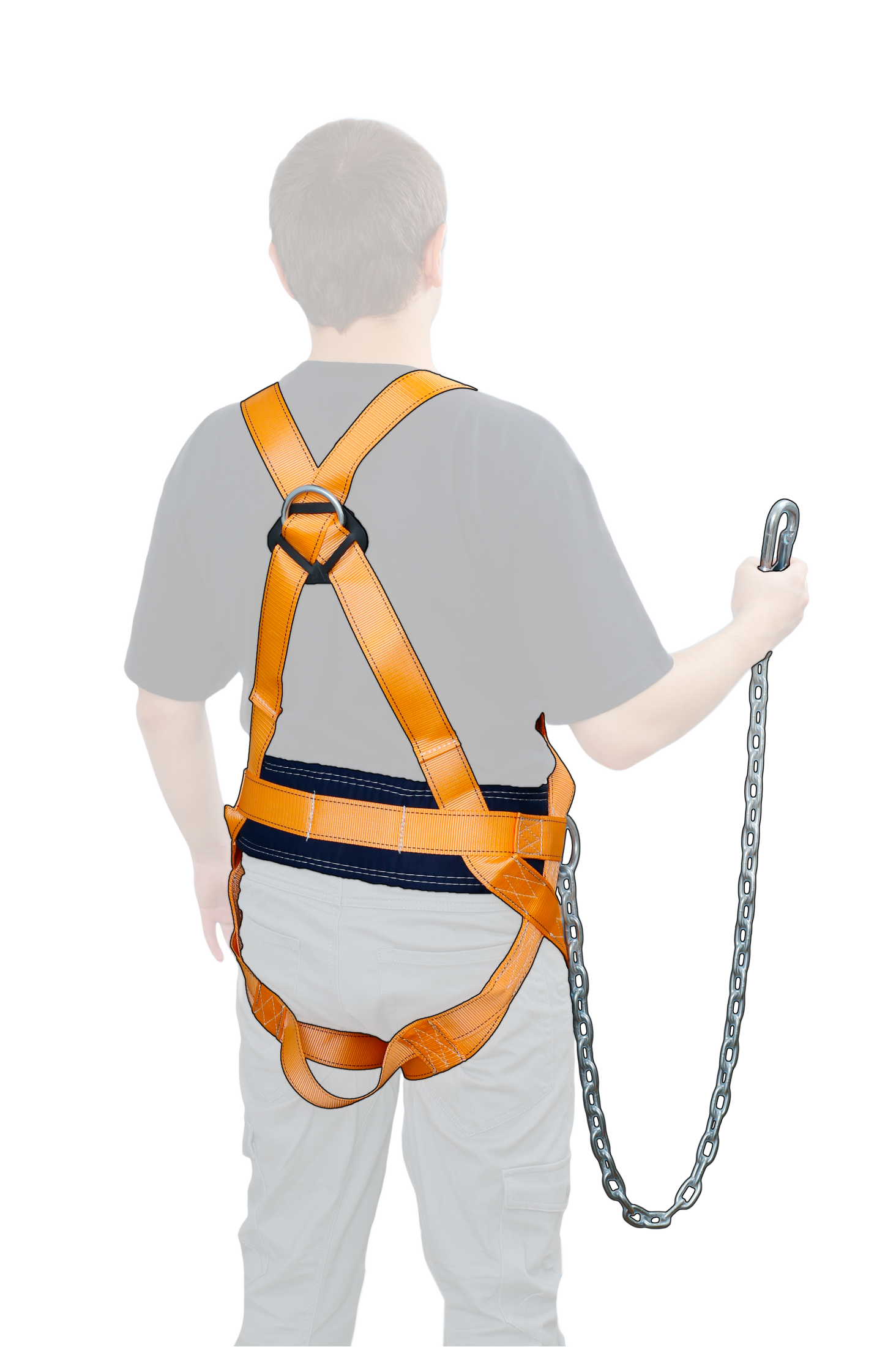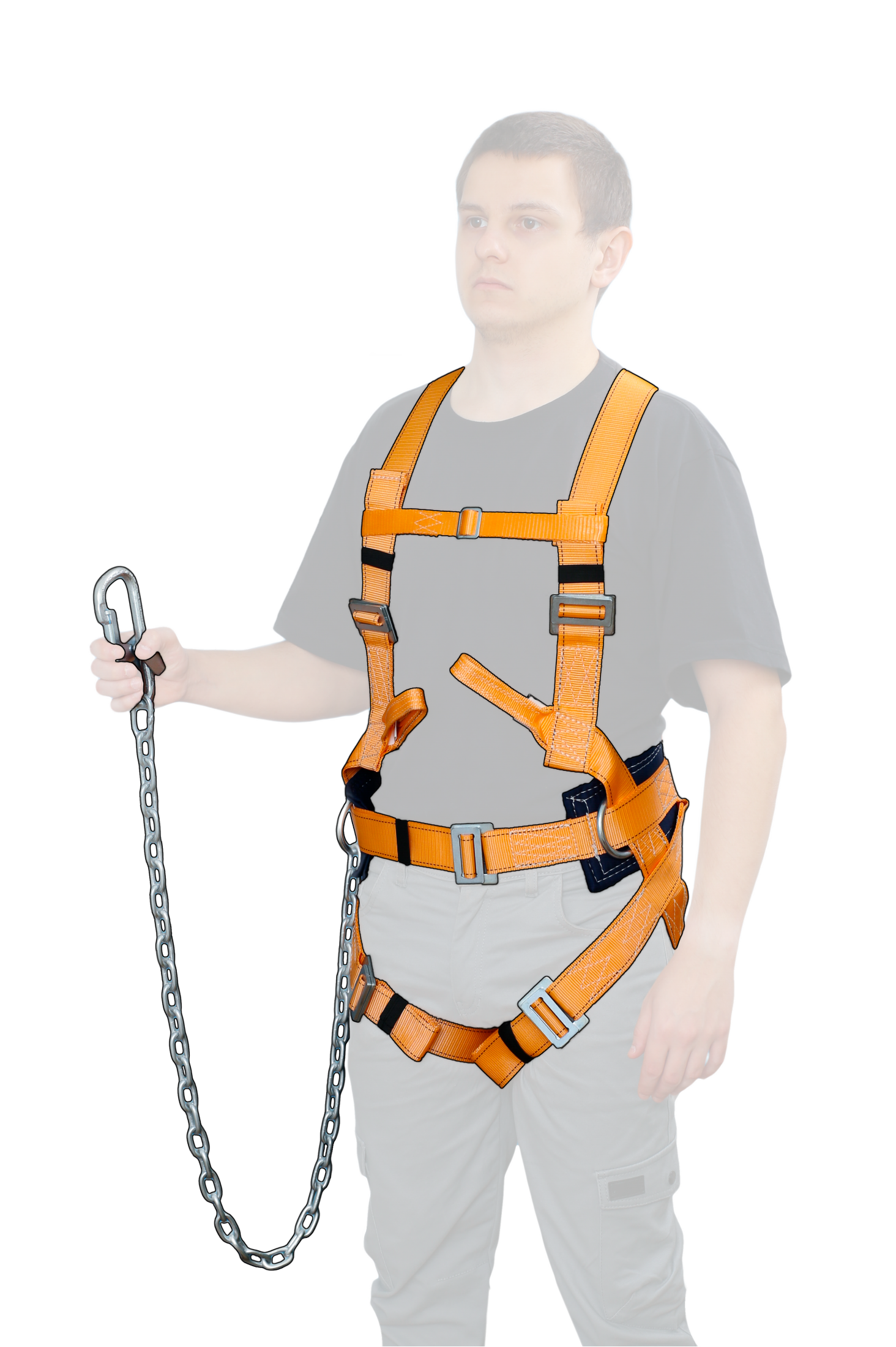 Страховочная привязь с наплечными и набедренными лямками — компонент страховочной системы для охвата тела человека с целью защиты тела работника при непредвиденном падении с высоты. Высокий (150мм) прошитый кушак обеспечивает максимальное удобство при длительном выполнении работ. Имеет четыре элемента крепления: два D-образных элемента крепления расположены по бокам привязи, одно на спине и анкерная петля на груди. Наличие регулируемых застёгивающих пряжек на наплечных и набедренных лямках позволяют за минимально короткое время подогнать привязь по размеру. Наличие вспомогательной ленты с застёжкой на груди позволяет быстро отстегуть и пристегнуть привязь. Строп подбирается, исходя из специфики задач. Рекомендуется использовать стропы с амортизатором для уменьшения силы рывка при падении.