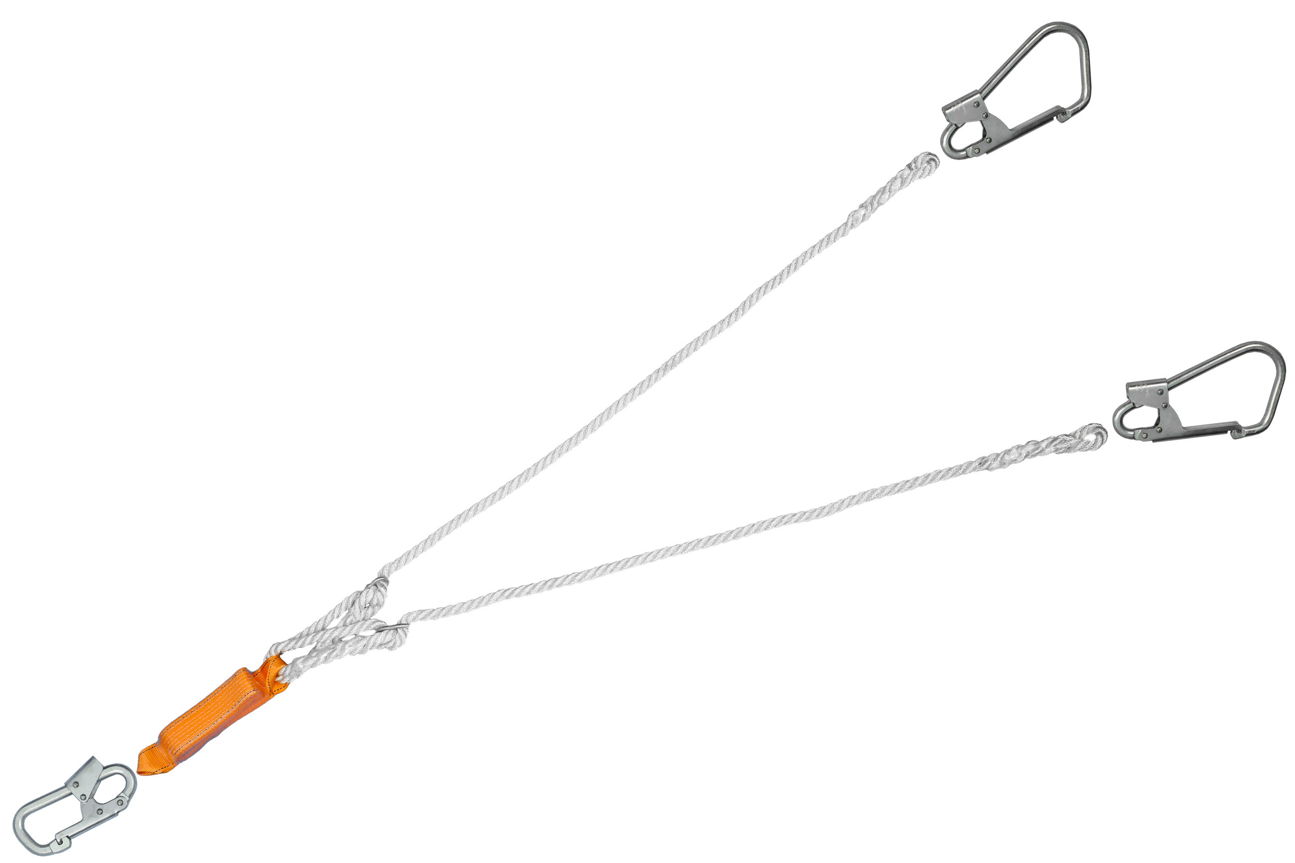 Строп из полиамидного каната д. 13 мм двухветьевой комбинации с амортизаторои и тремя карабинами (раскрытие 25 мм и 50 мм) используется как средство индивидуальной защиты от падения с высоты, может применяться как отдельная соединительная деталь, узел или компонент в системе с привязями и с анкерной точкой.